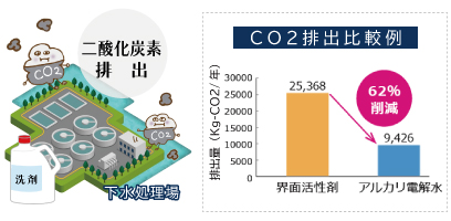 清掃や工業部品洗浄において、界面活性剤を含んだ洗剤が使用されています。洗剤は使用後に下水処理場で微生物処理され、水と二酸化炭素に分解されます。この処理で必ずCO2 排出が伴います。しかし、アルカリ電解水は界面活性剤を含んでいないため、洗剤をアルカリ電解水に代替することで、CO2排出を削減することが可能です。 |