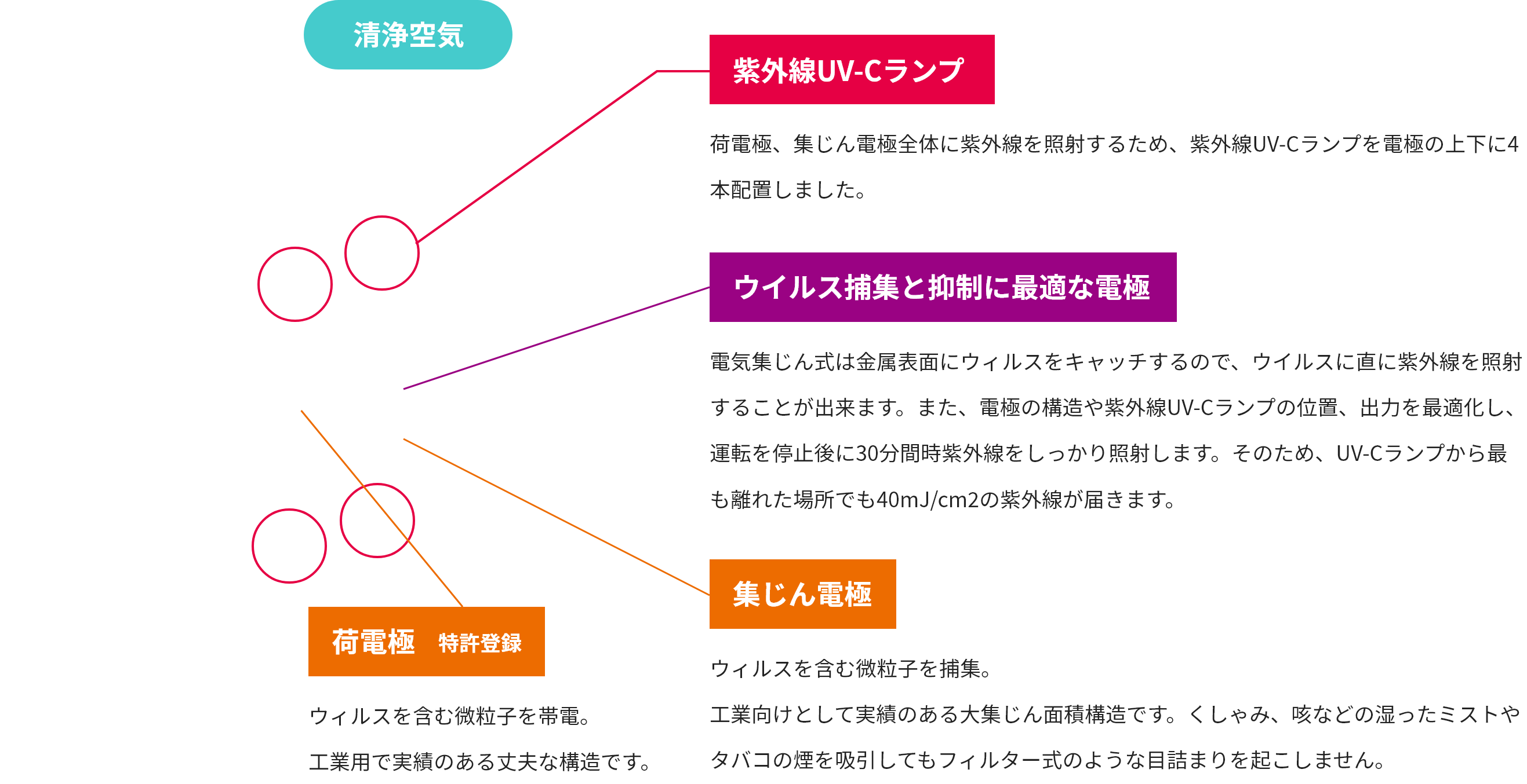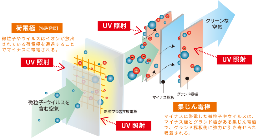 捕集したエアロゾルは、荷電極で帯電し、集じん電極により吸着します。1回の捕集工程で、ウイルスを含む0.1μmの微粒子を99.9%捕集し、クリーンな空気に浄化します。