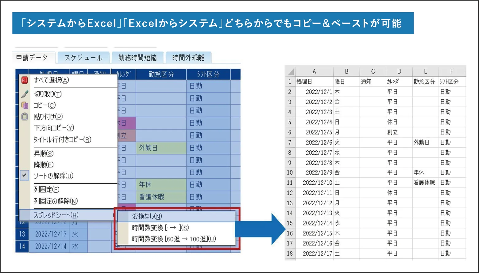 システムの任意画面をExcelへ出力可。時刻データは100進法にして出力も可(例:30分を0.5と出力)