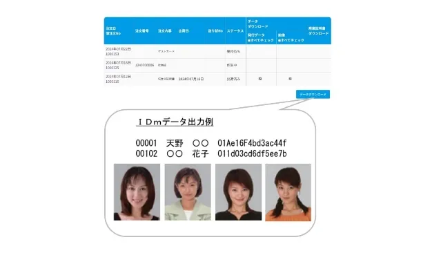 IDカードはトリミングされた写真データとカード固有番号(IDm/UID)をダウンロードする事ができます。